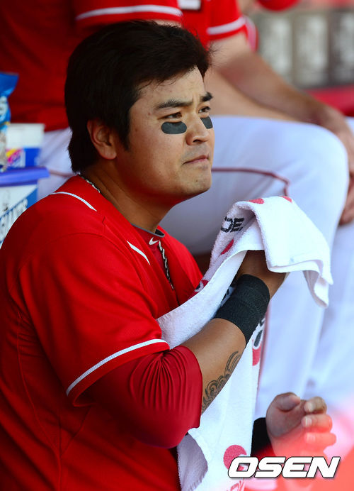 27일 새벽(이하 한국시간) 미국 오하이오주 신시내티 그레이트 아메리칸 볼파크에서 열린 신시내티 레즈와 시카고 컵스의 경기 1회말 선두타자 추신수가 삼진으로 물러난 후 덕아웃에서 땀을 닦고 있다.