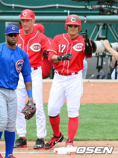 27일 새벽(이하 한국시간) 미국 오하이오주 신시내티 그레이트 아메리칸 볼파크에서 열린 신시내티 레즈와 시카고 컵스의 경기 4회말 2사 만루 잭 코자트가 2타점 2루타를 치자 추신수가 코자트에게 격려를 보내고 있다.