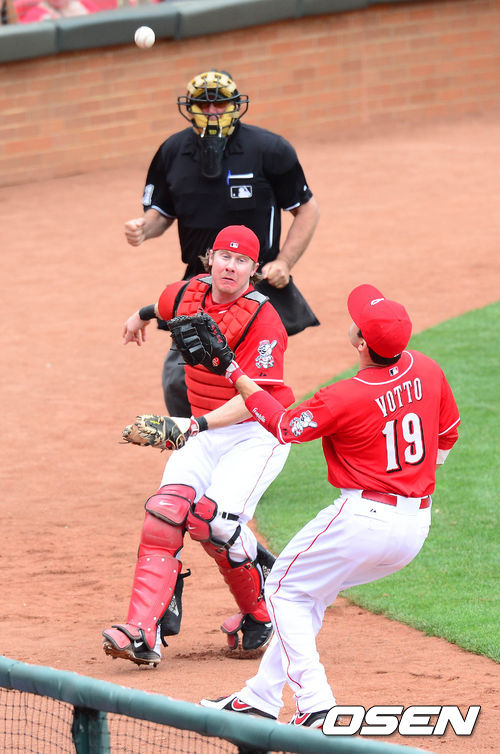 27일 새벽(이하 한국시간) 미국 오하이오주 신시내티 그레이트 아메리칸 볼파크에서 열린 신시내티 레즈와 시카고 컵스의 경기 5회초 무사 1루 카스티요의 뜬공을 보토가 잡고 있다.