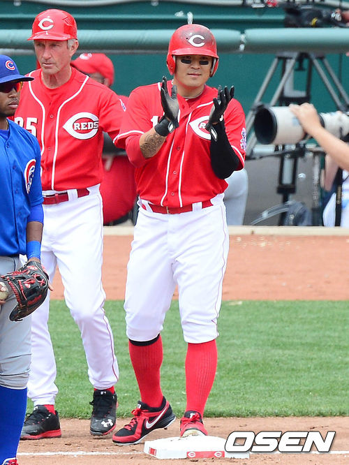 27일 새벽(이하 한국시간) 미국 오하이오주 신시내티 그레이트 아메리칸 볼파크에서 열린 신시내티 레즈와 시카고 컵스의 경기 4회말 2사 만루 코자트가 2타점 2루타를 치자 추신수가 코자트에게 격려를 보내고 있다.
