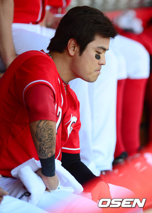 27일 새벽(이하 한국시간) 미국 오하이오주 신시내티 그레이트 아메리칸 볼파크에서 열린 신시내티 레즈와 시카고 컵스의 경기 1회말 추신수가 삼진을 당한 후 덕아웃에서 생각에 잠겨있다.