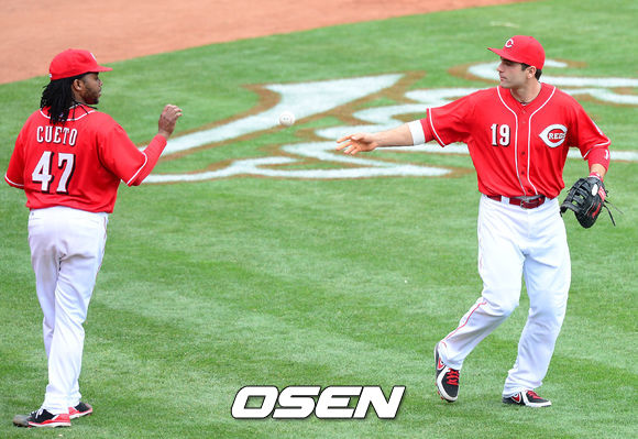 27일 새벽(이하 한국시간) 미국 오하이오주 신시내티 그레이트 아메리칸 볼파크에서 열린 신시내티 레즈와 시카고 컵스의 경기 5회초 무사 1루 카스티요의 뜬공을 보토가 잡아 쿠에토에게 건내고 있다.
