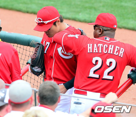 27일 새벽(이하 한국시간) 미국 오하이오주 신시내티 그레이트 아메리칸 볼파크에서 열린 신시내티 레즈와 시카고 컵스의 경기 5회초 종료 후 추신수가 덕아웃으로 향하면서 해처 코치의 격려를 받고 있다.