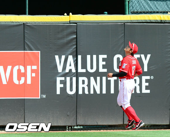 27일 새벽(이하 한국시간) 미국 오하이오주 신시내티 그레이트 아메리칸 볼파크에서 열린 신시내티 레즈와 시카고 컵스의 경기 8회초 2사 2루 소리아노의 홈런 타구를 추신수가 바라보고 있다.
