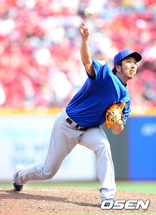 27일 새벽(이하 한국시간) 미국 오하이오주 신시내티 그레이트 아메리칸 볼파크에서 열린 신시내티 레즈와 시카고 컵스의 경기 8회말 마운드에 올라온 후지카와가 역투하고 있다.