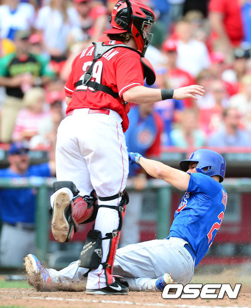 27일 새벽(이하 한국시간) 미국 오하이오주 신시내티 그레이트 아메리칸 볼파크에서 열린 신시내티 레즈와 시카고 컵스의 경기 10회초 2사 1루 카스티요의 1타점 2루타에 1루주자 헤어스톤이 득점하고 있다.
