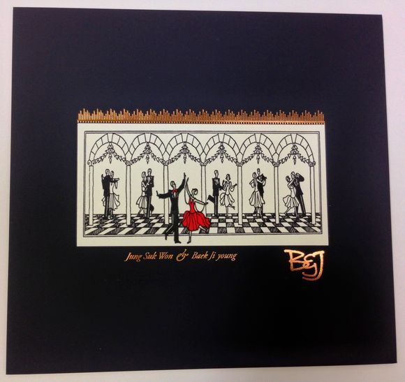 공개 된 청첩장에는 백지영과 정석원의 이니셜을 딴 B&J 이라는 골드 로고가 눈에 띄며 즐거운 파티 분위기의 배경에 백지영과 정석원이 많은 커플들 속에서 탱고를 추는 듯한 모습이 그림으로 담겨져있다.