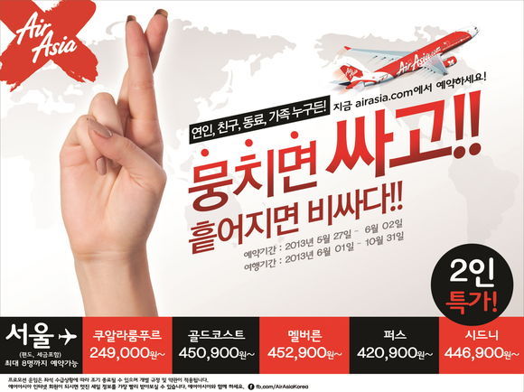 모든 프로모션 항공권은 인천 및 부산출발 기준으로 세금을 모두 포함한 2인기준 편도항공권 요금이며, 한정된 수량으로 조기에 매진될 수 있다. 에어아시아 엑스의 본 프로모션 항공권은 에어아시아 웹사이트(www.airasia.com)에서 6월2일까지 예약이 가능하다.