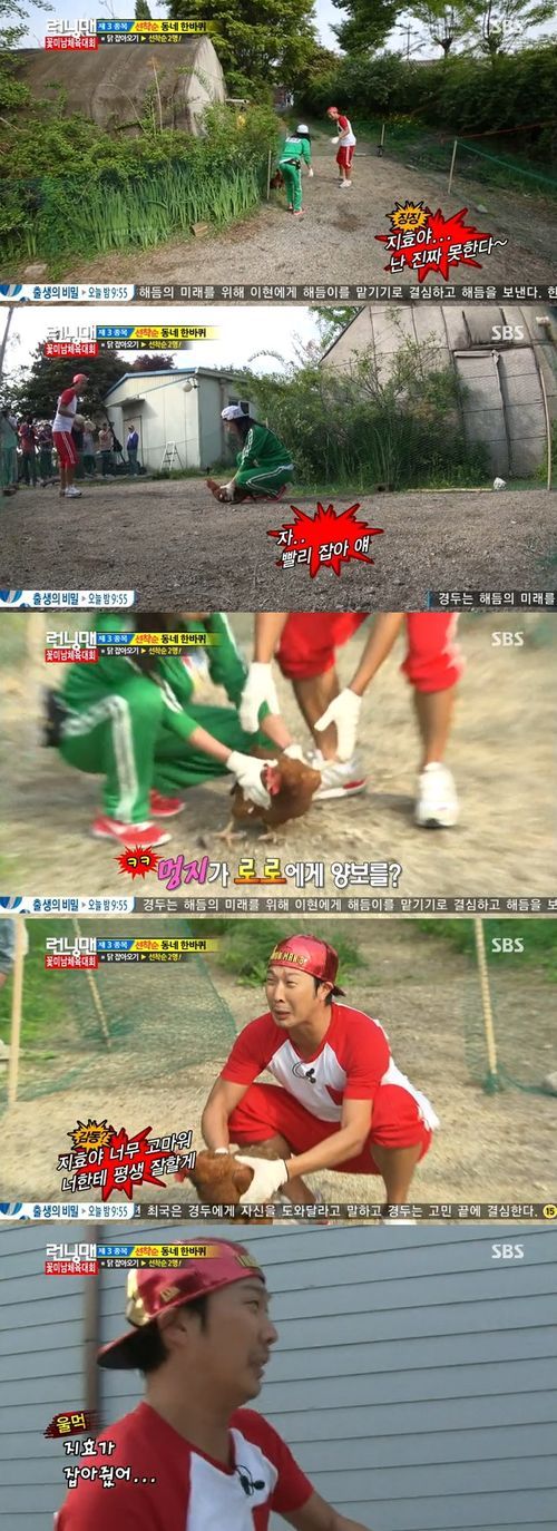 이때 송지효는 닭을 잡더니 하하에게 줬다. 김종국과 한 팀인 하하는 자신만 선착순 게임에서 성공하면 팀원이 모두 게임에 통과하는 상황으로 김종국에게 압박을 받고 있었기 때문. 이에 송지효가 닭을 잡아 하하에게 흔쾌히 양보했다.