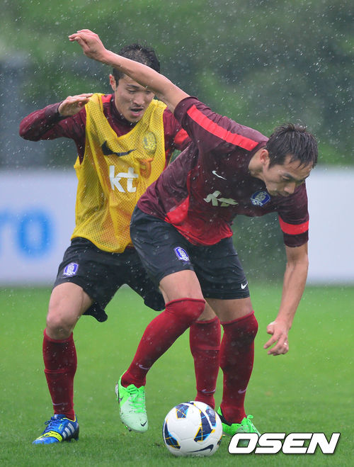 A대표팀에 소집된 김남일과 박종우가 27일 오후 파주 NFC에서 가진 공식 훈련에서 볼다툼을 벌이고 있다..