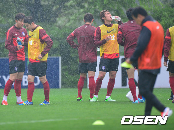 A대표팀에 소집된 선수들이 27일 오후 파주 NFC에서 가진 공식 훈련 중 음료을 마시며 휴식 시간을 갖고 있다.