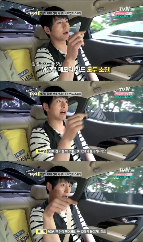 류수영은 27일 방송된 케이블채널 tvN 예능프로그램 ‘현장 토크쇼 택시’에서 ‘일밤-진짜 사나이’에 대해 “4박5일간 600시간 찍어온다”면서 “MBC 메모리 카드 다 쓰고 온다”고 혀를 내둘렀다.