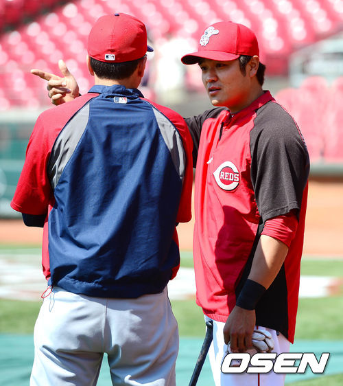 28일 새벽(이하 한국시간) 미국 오하이오주 신시내티 그레이트 아메리칸 볼파크에서 열리는 신시내티 레즈와 클리블랜드 인디언스의 경기 시작 전 추신수가 킵니스와 이야기를 나누고 있다.