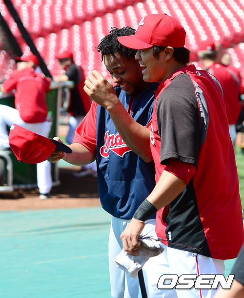 28일 새벽(이하 한국시간) 미국 오하이오주 신시내티 그레이트 아메리칸 볼파크에서 열리는 신시내티 레즈와 클리블랜드 인디언스의 경기 시작 전 추신수가 산타나와 이야기를 나누고 있다.