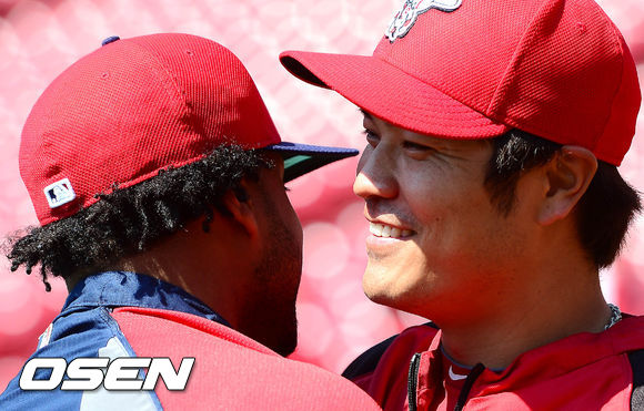 28일 새벽(이하 한국시간) 미국 오하이오주 신시내티 그레이트 아메리칸 볼파크에서 열리는 신시내티 레즈와 클리블랜드 인디언스의 경기 시작 전 추신수가 클리블랜드 선수들과 인사를 나누고 있다.