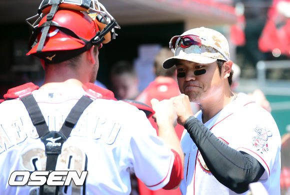 28일 새벽(이하 한국시간) 미국 오하이오주 신시내티 그레이트 아메리칸 볼파크에서 열린 신시내티 레즈와 클리블랜드 인디언스의 경기 시작 전 추신수가 메소라코와 하이파이브를 하고 있다.