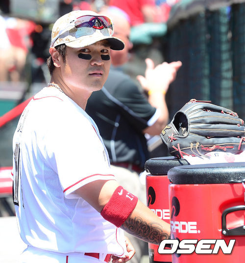 28일 새벽(이하 한국시간) 미국 오하이오주 신시내티 그레이트 아메리칸 볼파크에서 열린 신시내티 레즈와 클리블랜드 인디언스의 경기 시작 전 추신수가 덕아웃에서 경기 준비를 하고 있다.