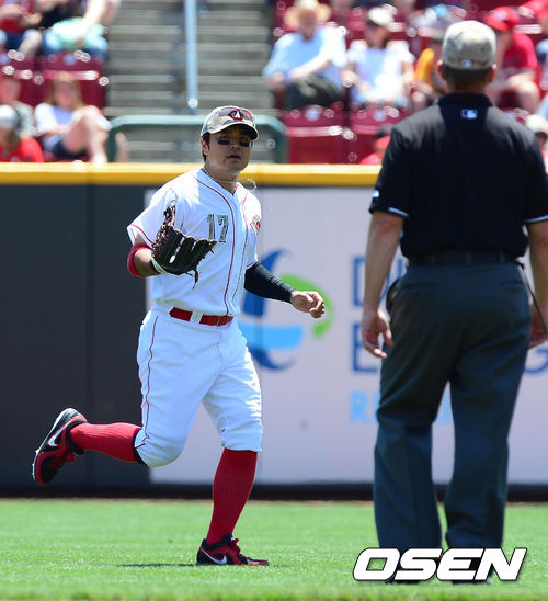 28일 새벽(이하 한국시간) 미국 오하이오주 신시내티 그레이트 아메리칸 볼파크에서 열린 신시내티 레즈와 클리블랜드 인디언스의 경기 2회초 종료 후 추신수가 덕아웃으로 향하며 2루심에게 공을 받고 있다.