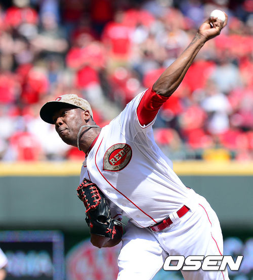 28일 새벽(이하 한국시간) 미국 오하이오주 신시내티 그레이트 아메리칸 볼파크에서 열린 신시내티 레즈와 클리블랜드 인디언스의 경기 9회초 채프먼이 역투를 펼치고 있다.