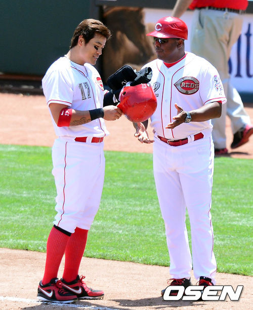 28일 새벽(이하 한국시간) 미국 오하이오주 신시내티 그레이트 아메리칸 볼파크에서 열린 신시내티 레즈와 클리블랜드 인디언스의 경기 5회말 2사 추신수가 내야땅볼로 물러난 후 해처 코치에게 장비를 건내고 있다.