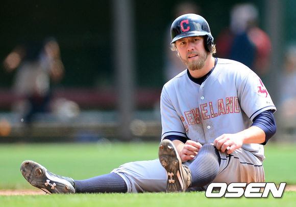 28일 새벽(이하 한국시간) 미국 오하이오주 신시내티 그레이트 아메리칸 볼파크에서 열린 신시내티 레즈와 클리블랜드 인디언스의 경기 7회초 1사 브랜틀리의 병살 상황, 1루주자 레널즈가 아웃된 후 주저앉아 있다.