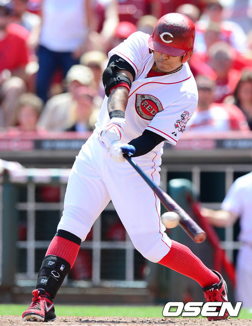 28일 새벽(이하 한국시간) 미국 오하이오주 신시내티 그레이트 아메리칸 볼파크에서 열린 신시내티 레즈와 클리블랜드 인디언스의 경기 8회말 선두타자 추신수가 좌전안타를 치고 있다.