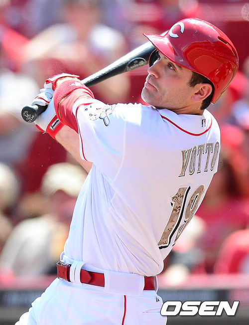 28일 새벽(이하 한국시간) 미국 오하이오주 신시내티 그레이트 아메리칸 볼파크에서 열린 신시내티 레즈와 클리블랜드 인디언스의 경기 8회말 1사 3루 조이 보토가 투런포를 치고 있다.