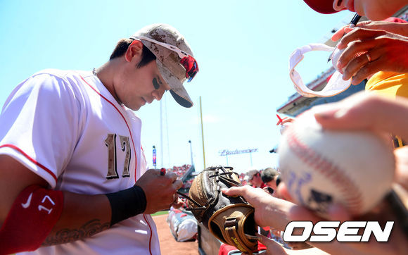 28일 새벽(이하 한국시간) 미국 오하이오주 신시내티 그레이트 아메리칸 볼파크에서 열린 신시내티 레즈와 클리블랜드 인디언스의 경기 시작 전 추신수가 팬들에게 사인을 하고 있다.