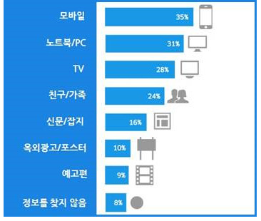 국내 스마트폰 사용자가 영화에 대한 정보를 얻을 때 가장 많이 이용하는 매체는 모바일(35%)인 것으로 드러났다. 같은 답변을 한 25세에서 34세 사이의 응답자는 46%로, 젊은 층이 영화 정보 검색에 모바일을 훨씬 더 많이 이용하는 것으로 나타났다. 전체 응답자 중 31%는 노트북이나 데스크톱에서, 28%는 TV에서 영화 관련 정보를 주로 얻는다고 대답했다.