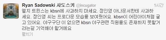 사도스키는 28일 자신의 트위터를 통해 "엘지 트윈스는 kbsn에 사과하지 마세요. 정인영 아나운서한테 사과하세요. 정인영 씨는 프로다운 모습을 보여줬어요"라며 "kbsn이 어린아이처럼 굴고 있어요. 야구구단이 없으면 kbsn 야구관련 직원들도 존재하지 못할거라는걸 기억해야 할거에요"라고 견해를 밝혔다.