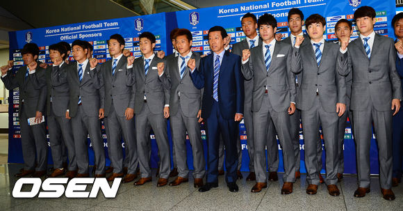 최강희 호가 28일 오후 다음달 열리는 레바논과의 2014 브라질 월드컵 아시아지역 최종예선 6차전 원정경기를 위해 출국했다. 출국전 대표팀이 포토타임을 갖고 있다.