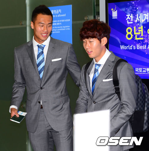 최강희 호가 28일 오후 다음달 열리는 레바논과의 2014 브라질 월드컵 아시아지역 최종예선 6차전 원정경기를 위해 출국했다. 김신욱이 손흥민과 출국장을 나서고 있다.