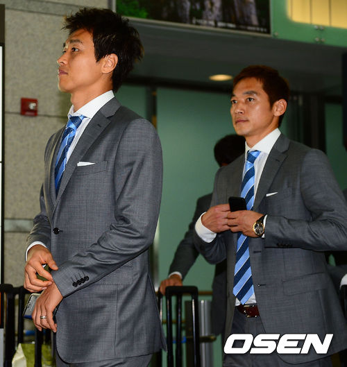 최강희 호가 28일 오후 다음달 열리는 레바논과의 2014 브라질 월드컵 아시아지역 최종예선 6차전 원정경기를 위해 출국했다. 출국 전 이동국과 김남일이 단정하게 슈트자켓을 만지고 있다.