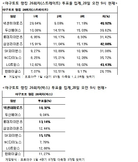 국민체육진흥공단(www.kspo.or.kr)이 발행하는 체육진흥투표권 수탁사업자인 스포츠토토 공식발매사이트인 베트맨(www.betman.co.kr)은 29일(수)에 개최되는 LG-한화, SK-삼성, 롯데-두산, NC-넥센 등 4경기 8개팀을 대상으로 한 야구토토 랭킹 26회차 스트레이트 게임 중간집계 결과 넥센(49.92%), LG(43.43%), 삼성(54.30%)을 차례로 다득점 상위 3개팀으로 꼽았다고 밝혔다. 반면 한화(26.75%)와 SK(31.06%)는 가장 적은 득점을 기록할 것으로 예상했다.