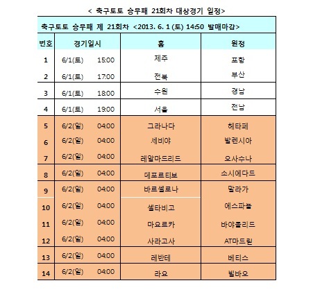 축구토토 승무패 21회차 게임은 오는 6월 1일(토) 오후 2시 50분에 발매가 마감된다.