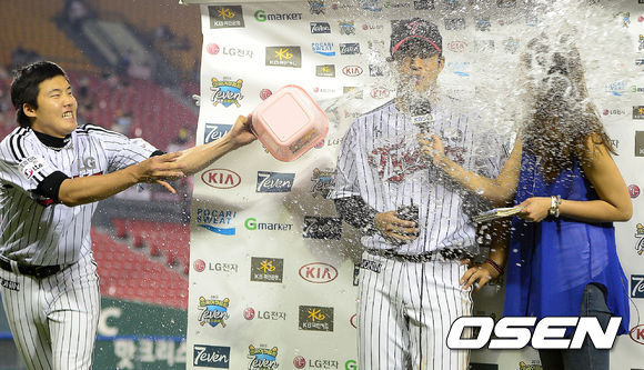 KBSN 정인영 아나운서는 지난 26일 서울 잠실아규장에서 열린 '2013 한국야쿠르트 세븐 프로야구' LG와 SK의 시즌 5차전이 끝난 후 이날 LG 승리의 주역인 정의윤 선수를 인터뷰 하던 중 난데없는 물벼락을 맞게 됐다. 같은 팀의 임찬규 선수가 승리의 기쁨을 담아 두 사람에게 물을 끼얹는 장난을 친 것.