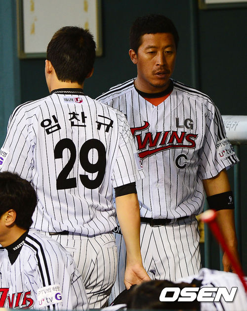 28일 오후 서울 잠실구장에서 열린 2013 한국야쿠르트 세븐프로야구 LG 트윈스와 한화 이글스 경기, 덕아웃에서 이병규가 임찬규 곁을 지나고 있다.