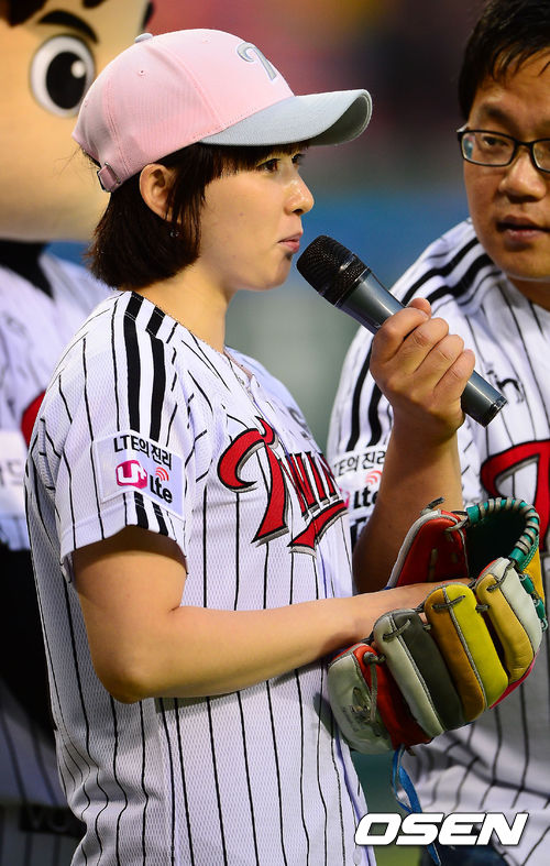 28일 오후 서울 잠실구장에서 열린 2013 한국야쿠르트 세븐프로야구 LG 트윈스와 한화 이글스 경기, '탁구얼짱' 서효원이 시구 전 인사를 하고 있다.