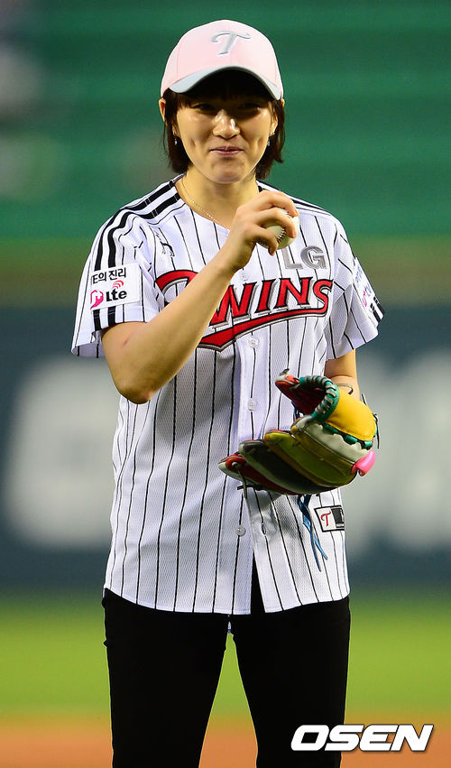 28일 오후 서울 잠실구장에서 열린 2013 한국야쿠르트 세븐프로야구 LG 트윈스와 한화 이글스 경기, '탁구얼짱' 서효원이 시구 전 야구공으로 탁구치는 포즈를 취하고 있다.