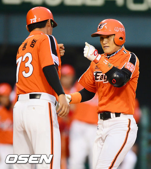 28일 오후 서울 잠실구장에서 열린 2013 한국야쿠르트 세븐프로야구 LG 트윈스와 한화 이글스 경기, 1회초 선두타자 한화 이대수가 좌월 선취 솔로홈런을 날린 후 홈을 밟으며 이종범 코치와 하이파이브를 하고 있다.