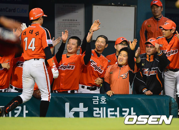 28일 오후 서울 잠실구장에서 열린 2013 한국야쿠르트 세븐프로야구 LG 트윈스와 한화 이글스 경기, 1회초 선두타자 한화 이대수가 좌월 선취 솔로홈런을 날린 후 덕아웃에서 동료들과 하이파이브를 하고 있다.