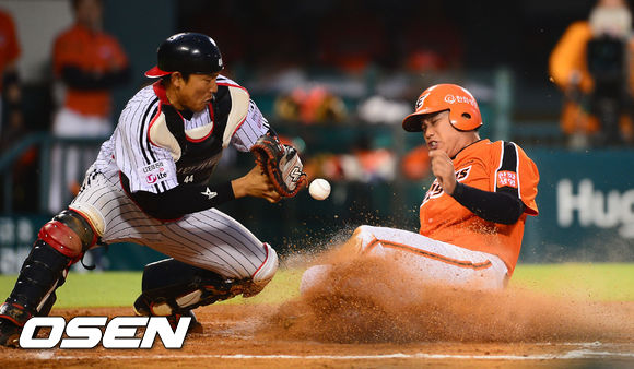 28일 오후 서울 잠실구장에서 열린 2013 한국야쿠르트 세븐프로야구 LG 트윈스와 한화 이글스 경기, 2회초 2사 주자 2루 한화 추승우의 우익수 앞 1타점 적시타때 2루 주자 최진행이 홈으로 몸을 던지고 있다.