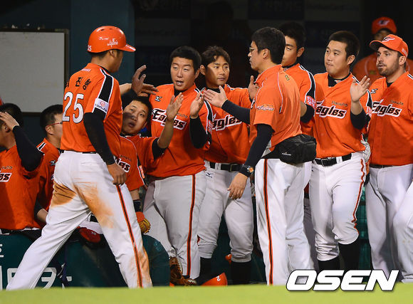 28일 오후 서울 잠실구장에서 열린 2013 한국야쿠르트 세븐프로야구 LG 트윈스와 한화 이글스 경기, 2회초 2사 주자 2루 한화 추승우의 우익수 앞 1타점 적시타때 2루 주자 최진행이 홈으로 몸을 던져 세이프 된 후 덕아웃에서 동료들과 하이파이브를 하고 있다.
