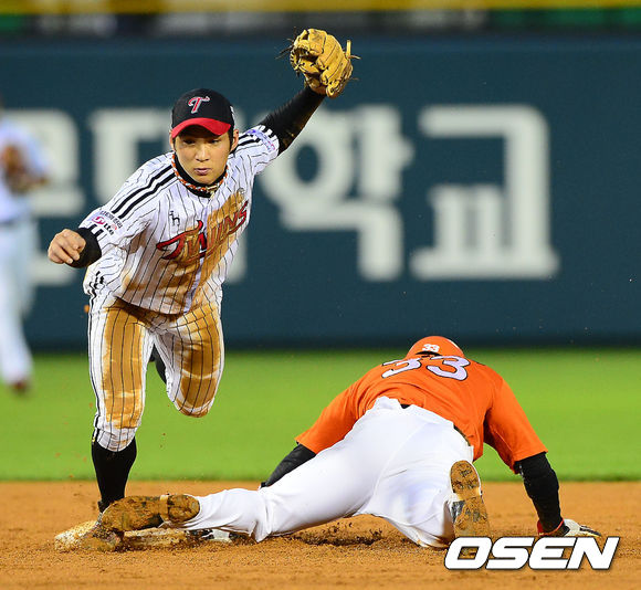 28일 오후 서울 잠실구장에서 열린 2013 한국야쿠르트 세븐프로야구 LG 트윈스와 한화 이글스 경기, 4회초 2사 주자 1루 한화 추승우 타석에서 1루 주자 이학준이 2루 도루를 시도했으나 LG 유격수 오지환에게 태그아웃을 당하고 있다.