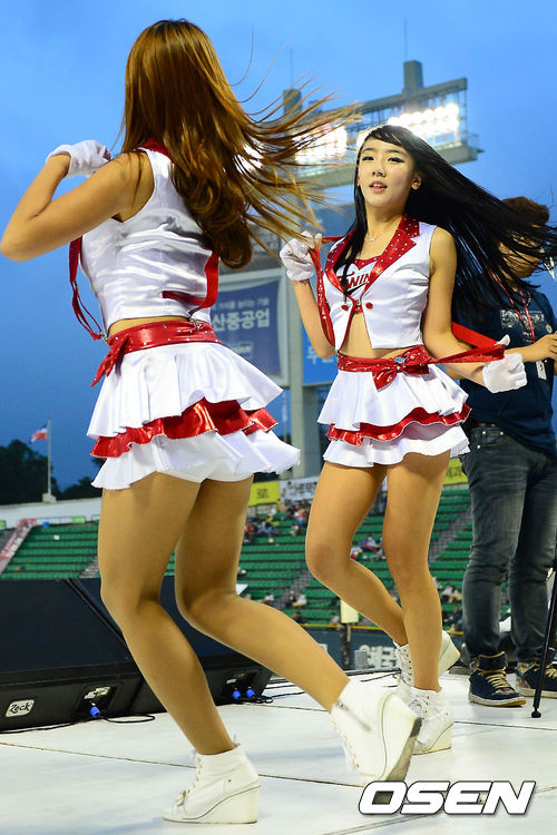28일 오후 서울 잠실구장에서 열린 2013 한국야쿠르트 세븐프로야구 LG 트윈스와 한화 이글스 경기, LG 김민지 치어리더들이 무대 위에서 화려한 공연을 펼치고 있다.