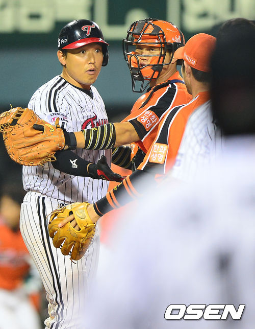 28일 오후 서울 잠실구장에서 열린 2013 한국야쿠르트 세븐프로야구 LG 트윈스와 한화 이글스 경기, 6회말 LG 윤요섭의 타석때 바티스타의 사인에 윤요섭이 발끈하며 한화와 LG 선수들이 그라운드로 뛰어들고 있다.