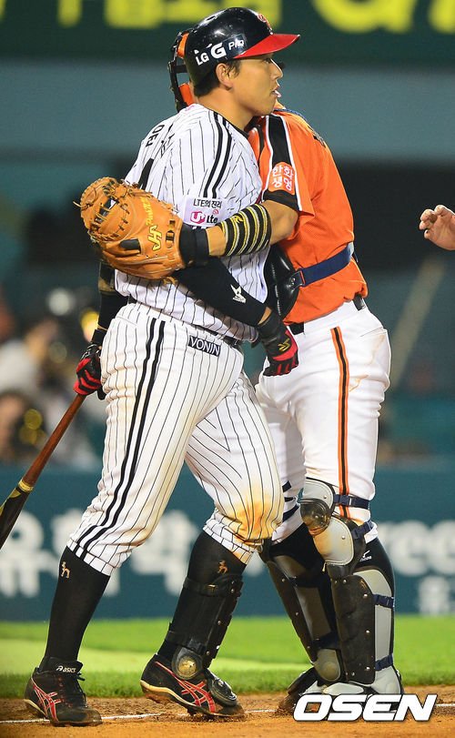 28일 오후 서울 잠실구장에서 열린 2013 한국야쿠르트 세븐프로야구 LG 트윈스와 한화 이글스 경기, 6회말 LG 윤요섭의 타석때 신경전을 벌이다 양팀 선수들이 그라운드로 뛰어들고 있다.