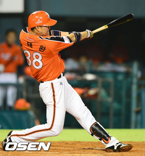 28일 오후 서울 잠실구장에서 열린 2013 한국야쿠르트 세븐프로야구 LG 트윈스와 한화 이글스 경기, 8회초 1사 주자 없는 상황에서 한화 김태완이 좌월 솔로홈런을 날리고 있다.