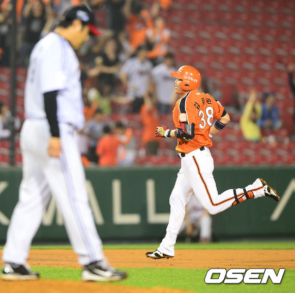 28일 오후 서울 잠실구장에서 열린 2013 한국야쿠르트 세븐프로야구 LG 트윈스와 한화 이글스 경기, 8회초 1사 주자 없는 상황에서 한화 김태완이 좌월 솔로홈런을 날린 후 그라운드를 돌고 있다.