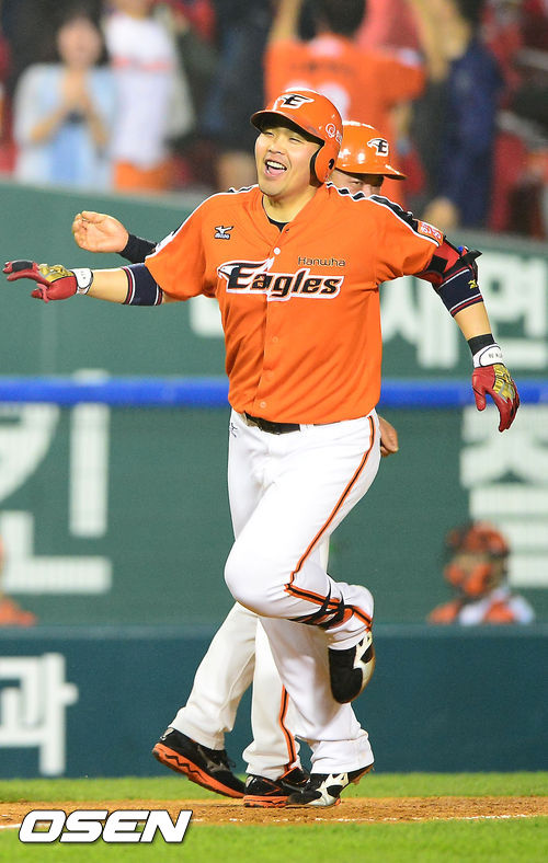 28일 오후 서울 잠실구장에서 열린 2013 한국야쿠르트 세븐프로야구 LG 트윈스와 한화 이글스 경기, 8회초 1사 주자 없는 상황에서 한화 김태완이 좌월 솔로홈런을 날린 후 3루에서 오대석 코치와 하이파이브를 하고 있다.